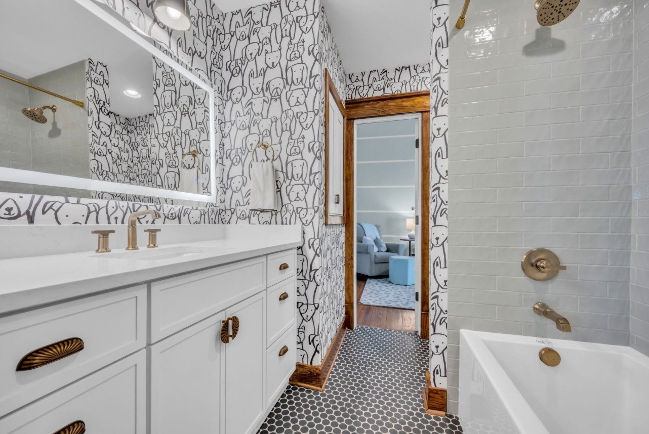 Renovated front entry hall (piano room) and jack and jill bathroom